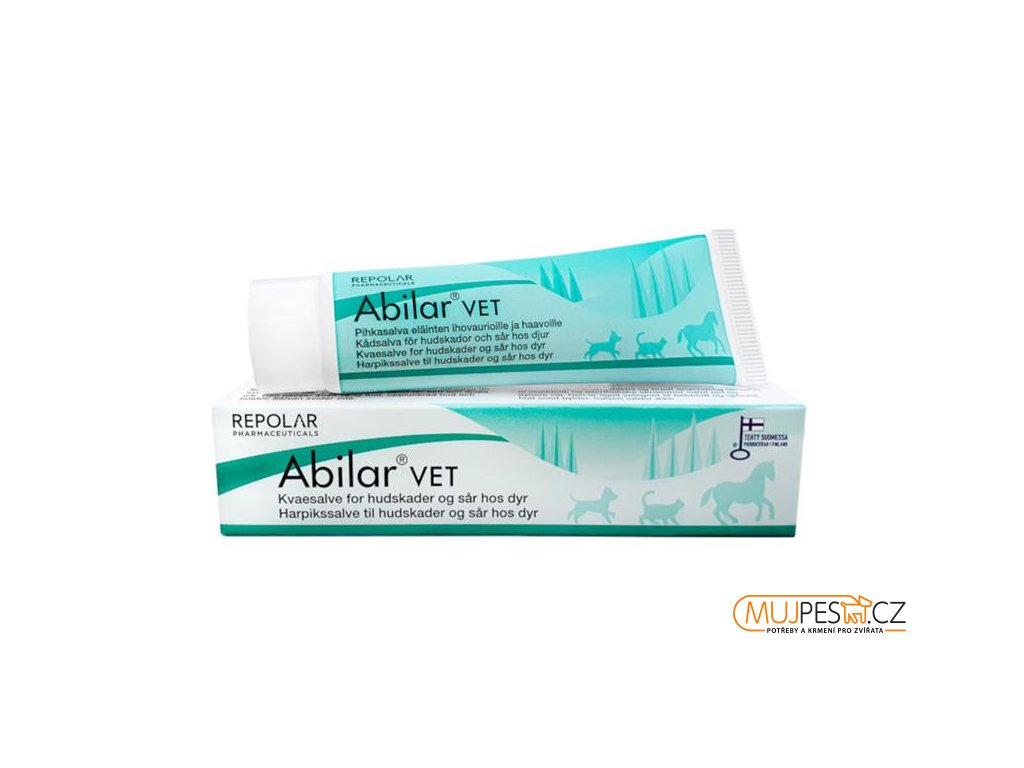 Abilar VET zanechává na kůži ochranný film, který se nerozpouští ani ve vlhkých podmínkách (tlapky, drápy). Pryskyřicová hořká příchuť masti snižuje snahu zvířete ránu olizovat.