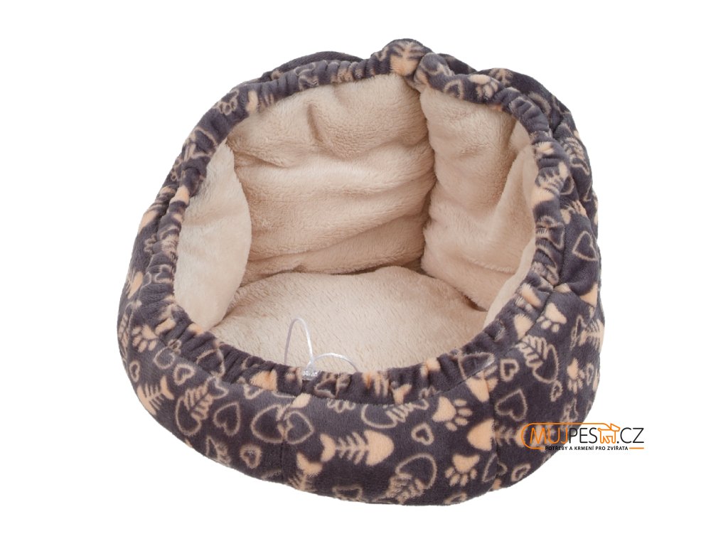 Pelíšek Adriana De Luxe s potiskem rybích kostřiček, srdíček a psích tlapek, vnější strana pelíšku tmavá, vnitřní svělejší. Měkký a hřejivý materiál, vyšší zadní část pelíšku chrání Vaše pejska či kočičku před průvanem. Průměr základny 40 nebo 50cm. Dvojí velikost.