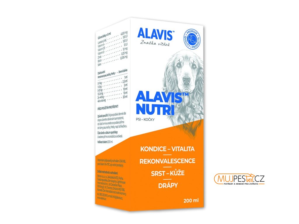 ALAVIS™ Nutri je veterinární přípravek obsahující lososový olej, vitaminy (A, D3, E, biotin) a minerální látky (Zn, Se) pro rekonvalescenci, lepší kondici a vitalitu a pro kvalitní, lesklou a zdravou srst, kůži a drápky u psů, koček a fretek.