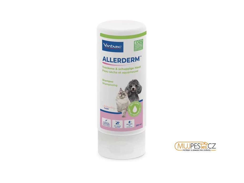 Allerderm suchá a šupinatá kůže je jemný šampon bez mýdla určený k častému používání pro optimalizaci stavu kůže a srsti psů a koček všech věkových kategorií.