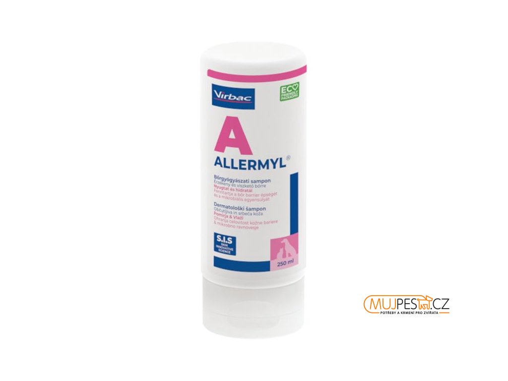 Allermyl je jemný, hypoalergenní dermatologický šampon bez mýdla určený k častému použití a optimalizaci stavu kůže a srsti psů a koček všech věkových kategorií s citlivou a svědivou kůží. Obsahuje technologii S–I–S (Skin–Innovative–Science) a Skin Lipid Complex (komplex kožních lipidů).