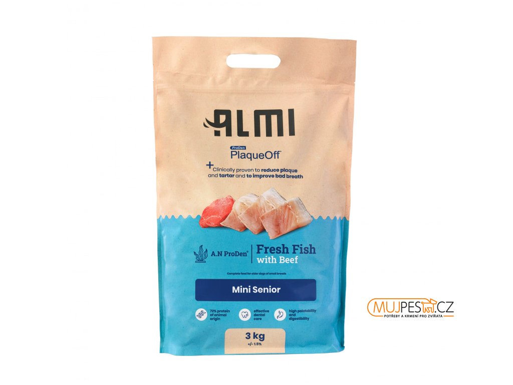Krmivo s efektem na zdraví dutiny ústí. Krmivo Almi pro psí seniory.