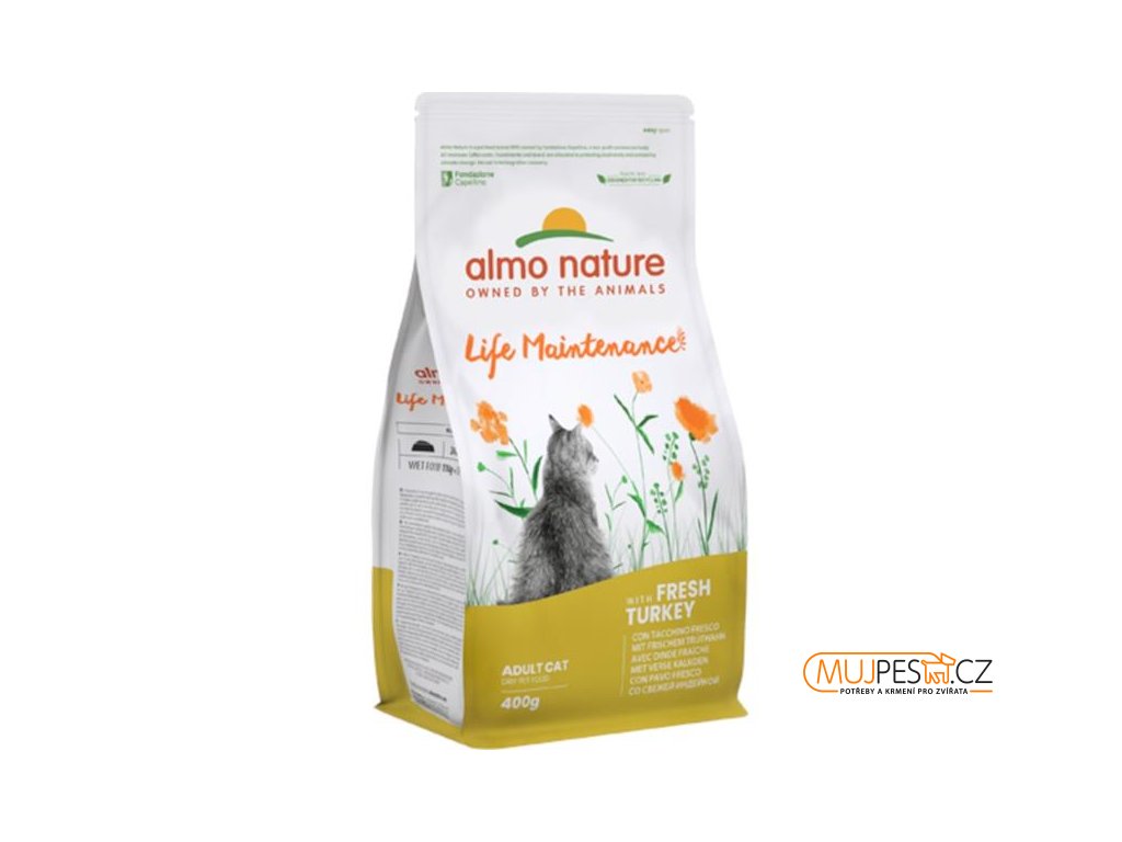 Almo Nature Life Maintenance je kompletní krmivo určené pro dospělé kočky. Jako hlavní složku obsahuje 26 % čerstvého krůtího masa, které zajišťuje vysokou chutnost krmiva. Dále je obohaceno o omega-3 a omega-6 mastné kyseliny, minerály, vitamíny, taurin a prebiotika pro podporu střevní mikroflóry. Granule jsou konzervovány přírodně, neobsahují dochucovadla, barviva ani soli a nejsou testována na zvířatech.