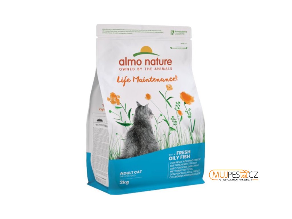 Almo Nature Life Maintenance je kompletní krmivo určené pro dospělé kočky. Jako hlavní složku obsahuje 26 % čerstvých tučných ryb (ančoviček), které zajišťují vysokou chutnost krmiva. Dále je obohaceno o omega-3 a omega-6 mastné kyseliny, minerály, vitamíny, taurin a prebiotika pro podporu střevní mikroflóry. Granule jsou konzervovány přírodně, neobsahují GMO, dochucovadla, barviva ani soli a nejsou testována na zvířatech.
