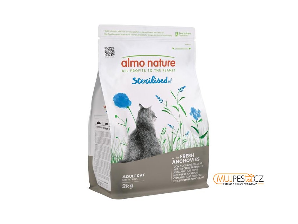 Almo Nature Sterilised je kompletní krmivo určené pro kastrované a méně aktivní dospělé kočky. Nízký obsah tuku a hořčíku spolu s dostatečným množstvím vlákniny činí z této receptury vhodnou volbu pro sterilizované kočky a kočky se sklonem k nadváze. Ideální je v kombinaci s kapsičkami Sterilised. Jako hlavní složku obsahuje 26 % čerstvých ryb (ančoviček), které zajišťují vysokou chutnost krmiva. Dále je krmivo obohaceno o omega-3 a omega-6 mastné kyseliny, minerály, vitamíny, taurin, L-karnitin a prebiotika pro podporu střevní mikroflóry. Granule jsou konzervovány přírodně, neobsahují GMO, dochucovadla, barviva ani soli.