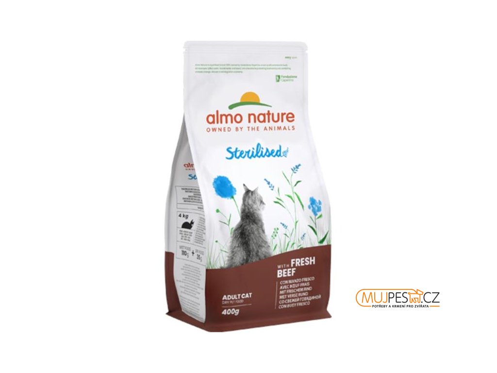 Almo Nature Sterilised je kompletní krmivo určené pro kastrované a méně aktivní dospělé kočky. Nízký obsah hořčíku spolu s dostatečným množstvím vlákniny činí z této receptury vhodnou volbu pro sterilizované kočky. Ideální je v kombinaci s kapsičkami Sterilised. Jako hlavní složku obsahuje 26 % čerstvého hovězího masa, které zajišťuje vysokou chutnost krmiva. Dále je krmivo obohaceno o omega-3 a omega-6 mastné kyseliny, minerály, vitamíny, taurin a prebiotika pro podporu střevní mikroflóry. Granule jsou konzervovány přírodně, neobsahují GMO, dochucovadla, barviva ani soli.