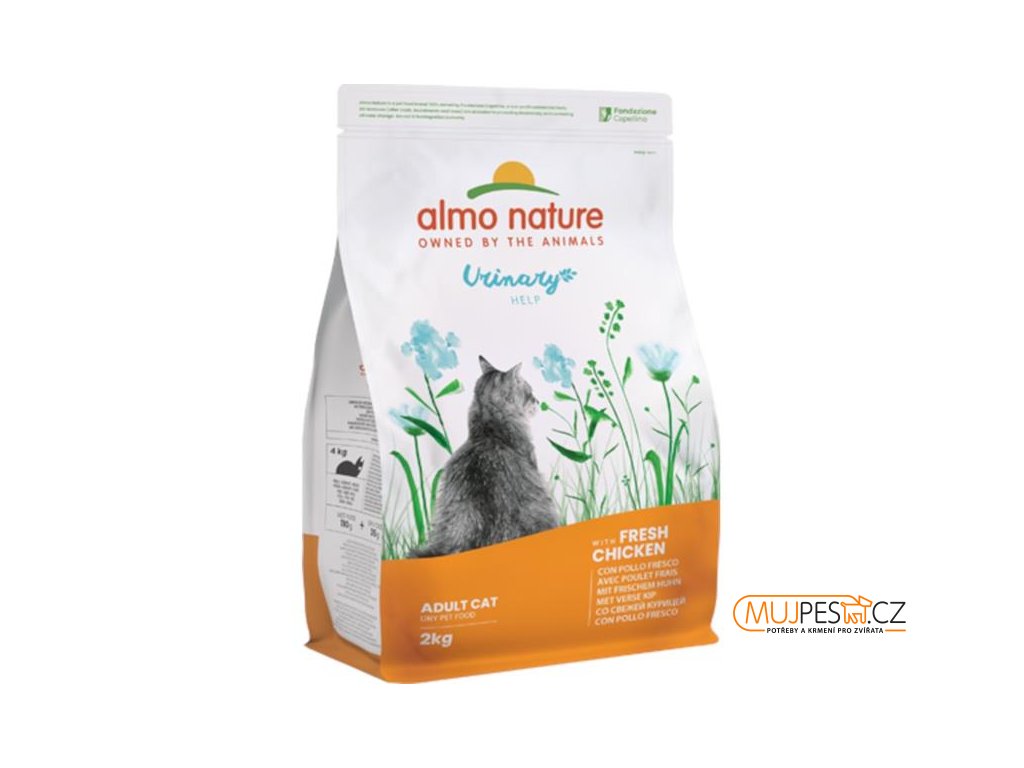 Almo Nature Urinary Help je kompletní krmivo určené pro dospělé kočky trpící na struvitové močové kameny. DL-methionin snižuje pH moči a vytváří tak nepříznivé prostředí pro tvorbu struvitových krystalů. Nízký obsah hořčíku, vápníku a fosforu v kombinaci s glukosaminem pomáhá k udržení zdravého močového ústrojí. Jako hlavní složku krmivo obsahuje 26 % čerstvého kuřecího masa, které zajišťuje jeho vysokou chutnost. Dále je obohaceno o omega-3 a omega-6 mastné kyseliny, minerály, vitamíny, taurin a L-lysin pro podporu imunitního systému. Granule jsou konzervovány přírodně, neobsahují GMO, dochucovadla, barviva ani soli.
