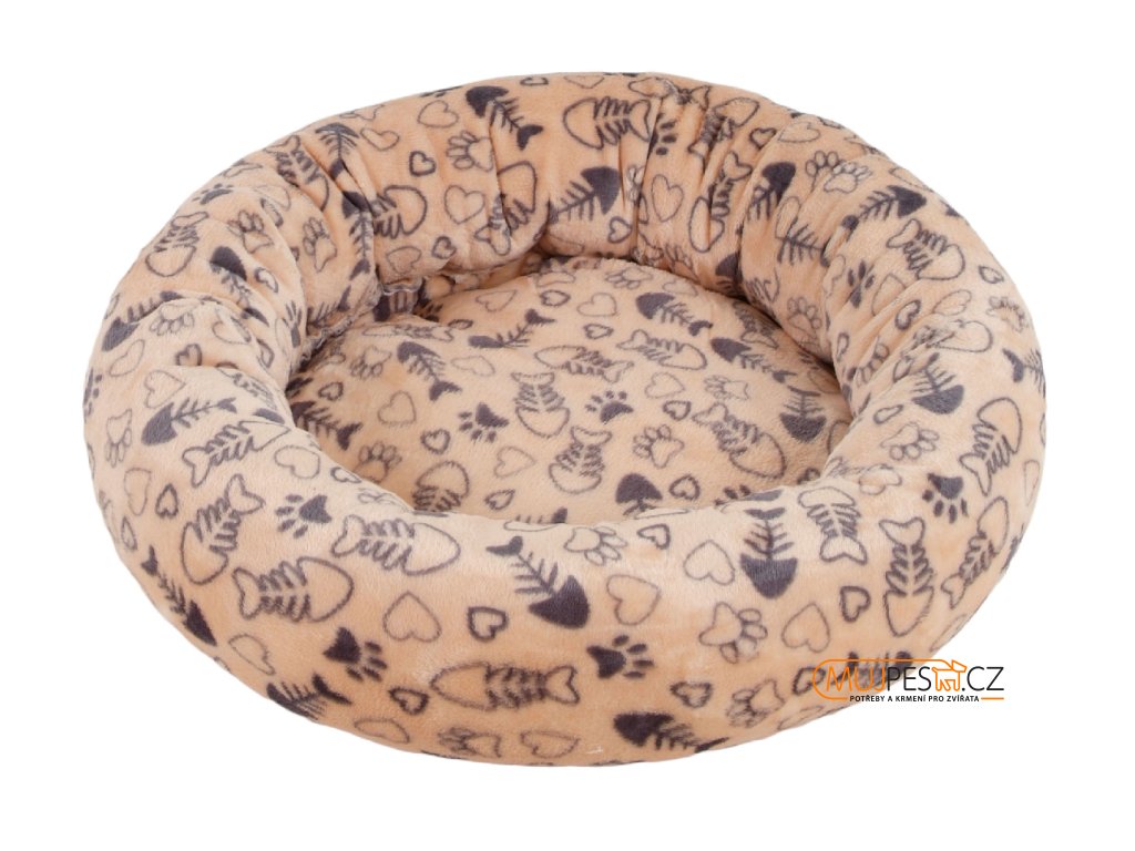 Béžový vzor pelíšku Amélie De Luxe s potiskem tlapek, srdíček a kostry rybky. Průměr od 40 do 80cm. Z měkkého a poddajného materiálu. Vyplněno dutým vláknem. Průměr pelíšku lze volit z velikostí 40, 50, 60, 70 a 80cm, jde o vnější průměr. Zvýšený kraj pelíšku má cca 15cm.