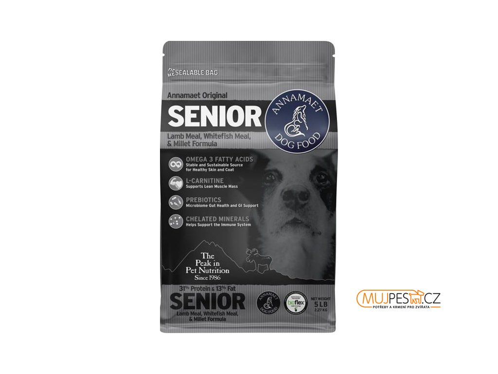 Nové kompletní krmivo z řady Annamaet Original pomáhá zejména starším psům udržet si dobrou kondici i navzdory vyššímu věku. Hlavními živočišnými složkami, jež zajišťují optimální aminokyselinový profil, jsou bílé mořské ryby a jehněčí. Ve složení najdete mimo jiné kurkumu, jednu z nejsilnějších přírodních protizánětlivých látek, a kokosový olej, bohatý zdroj triglyceridů se středně dlouhým řetězcem (MCT), které fungují jako alternativní „palivo“ pro stárnoucí mozek. Dýně a další prebiotika napomáhají trávení a vyšší obsah bílkovin přispívá k zachování svalové hmoty bez tvorby tuku.
