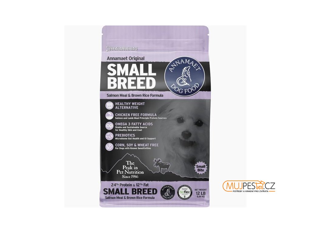 Krmivo Annamaet Original Small Breed Salmon je receptura z lososa a jehněčího masa splňující nutriční potřeby psů malých a toy plemen ve všech životních stadiích – je vhodné pro štěňata, březí a kojící feny i dospělé psy. Jde o alternativu ke kuřecí receptuře Annamaet Small Breed Chicken, oproti níž má nižší obsah tuku.