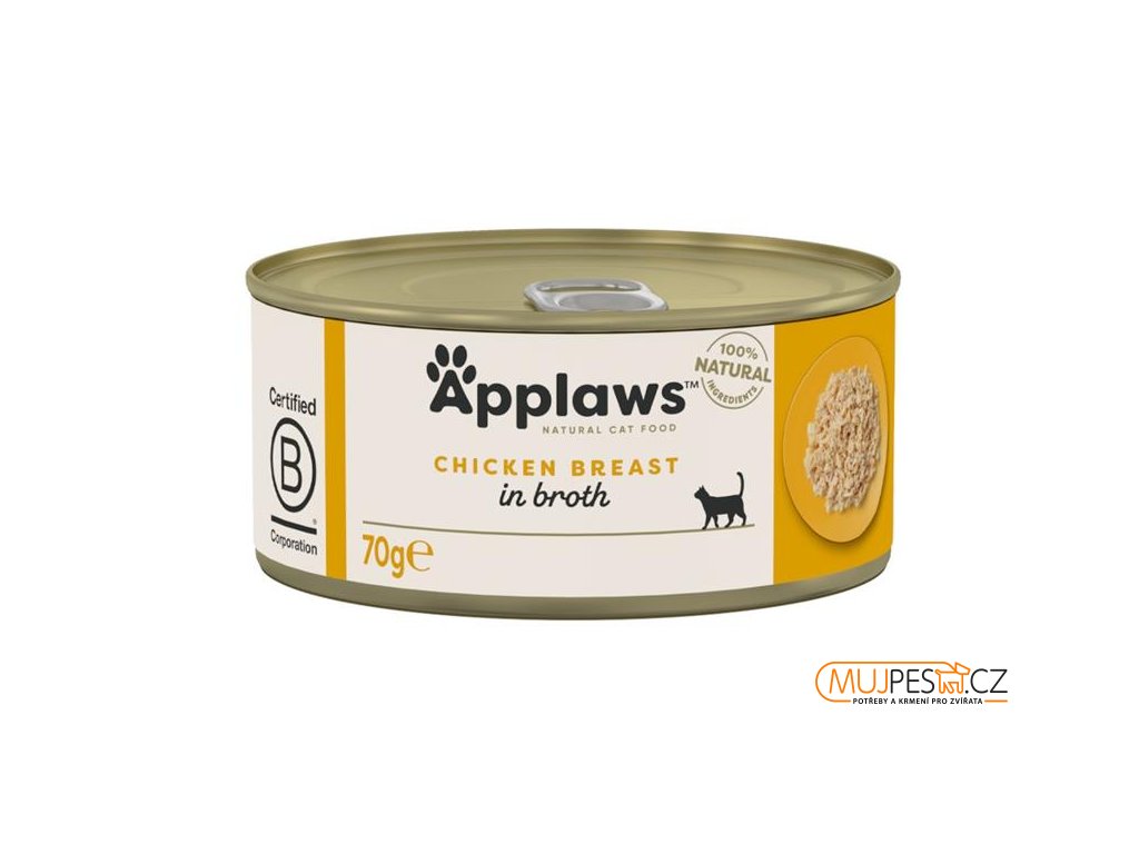 Konzerva Applaws je lehce stravitelné, nutričně vysoce hodnotné, přirozeně bezlepkové, hypoalergenní a hlavně velmi chutné krmení! 100% přírodní krmivo bez umělých konzervačních látek, barviv nebo dochucovadel. Kvalitu poznáte na první pohled po otevření konzervy: přirozená konzistence trhaného masa z kuřecích prsou v lahodném kuřecím vývaru vás přesvědčí a vaši kočku nadchne. Maso pochází z kuřat, která jsou chována ve volných výbězích, krmena přirozeně bez použití hormonů a antibiotik, jsou zdravá a v potravinářské kvalitě.