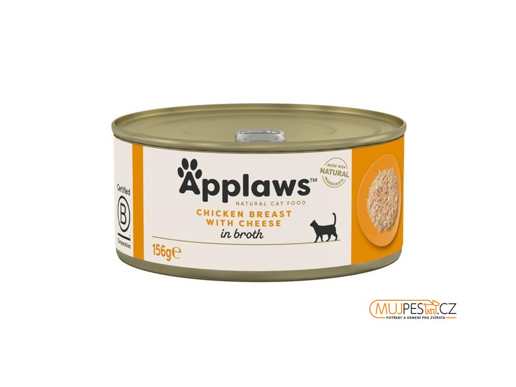 Konzerva Applaws je lehce stravitelné, nutričně vysoce hodnotné, přirozeně bezlepkové, hypoalergenní a hlavně velmi chutné krmení. 100% přírodní doplňkové krmivo bez umělých konzervačních látek, barviv nebo dochucovadel. Kvalitu poznáte na první pohled po otevření konzervy: přirozená konzistence trhaného masa z kuřecích prsou v lahodném kuřecím vývaru vás přesvědčí a vaši kočku nadchne. Kousky sýra dodávají konzervě atraktivní chuť. Maso pochází z kuřat, která jsou chována ve volných výbězích, krmena přirozeně bez použití hormonů a antibiotik, jsou zdravá a v potravinářské kvalitě.