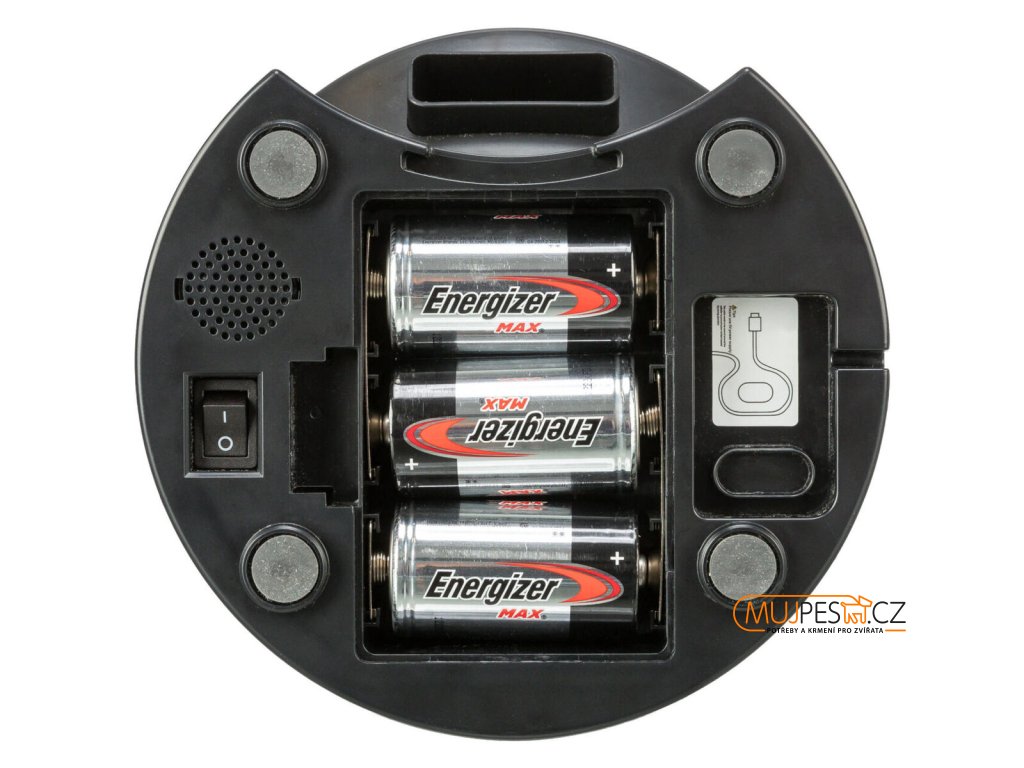 Snadnou údržbu zajišťuje vyjímatelná nerezová miska, kterou lze mýt v myčce. Možnost bateriového provozu (3× D monočlánky, nejsou součástí balení) zajistí spolehlivé krmení i při výpadku proudu. Automatický zámek tlačítek zabraňuje nechtěné změně nastavení.