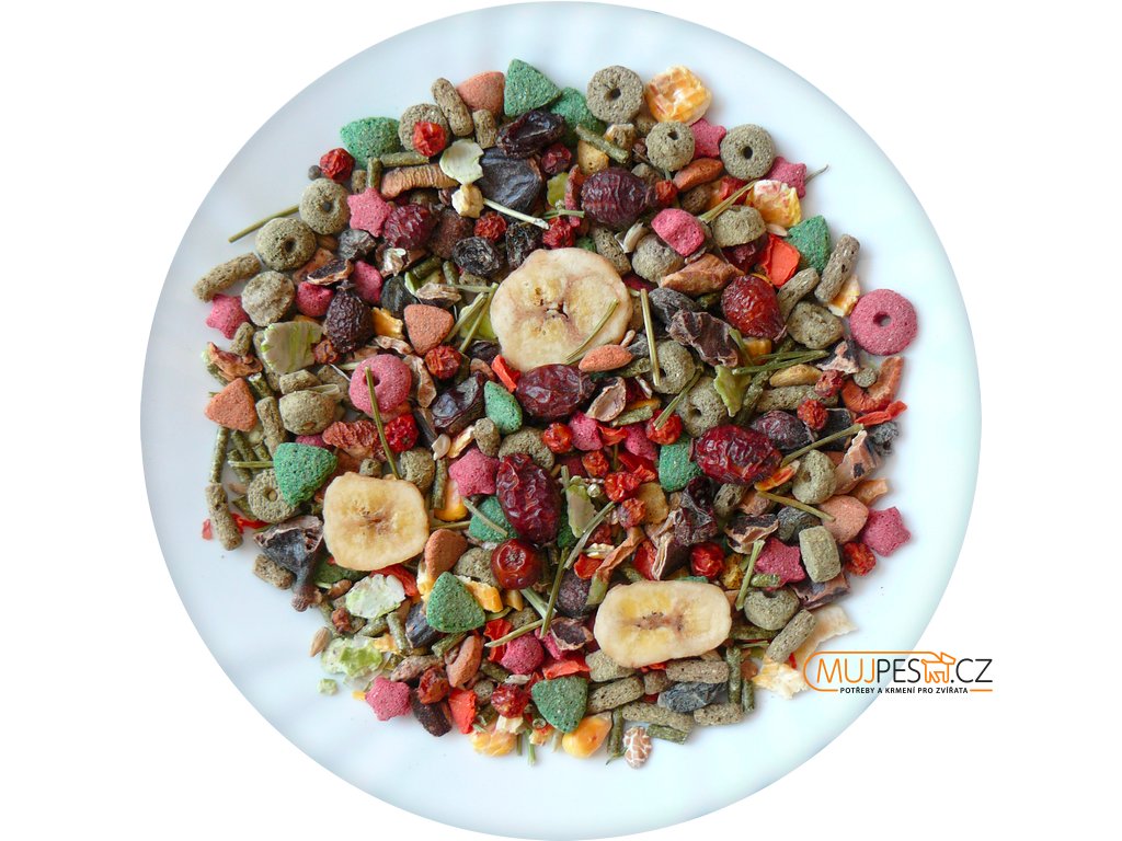 Složení: kukuřičné vločky, slunečnice bílá, vojtěška, extrudované obiloviny, svatojánský chléb, kukuřice, podzemnice loupaná, hrachové vločky, banány, rozinky, šípky, oves celý, čirok, kardi, pšenice, mrkev, dýně