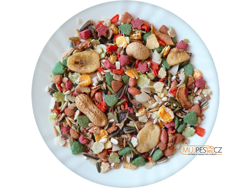 Složení: ovoce, (banány, jablka, rozinky, aronie), pšenice, kukuřice, pšeničné vločky, svatojánský chléb, burské ořechy, hrachové vločky, safrol, slunečnice, kukuřičné vločky, čirok, ječmen, vojtěška, oves, mrkev, pohanka.