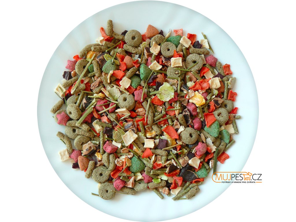 Složení: vojtěška, pšenice, extrudované obiloviny, kukuřičné vločky, mrkev, ječmen, rohovník obecný, kukuřice, hrachové vločky, červená řepa, petržel