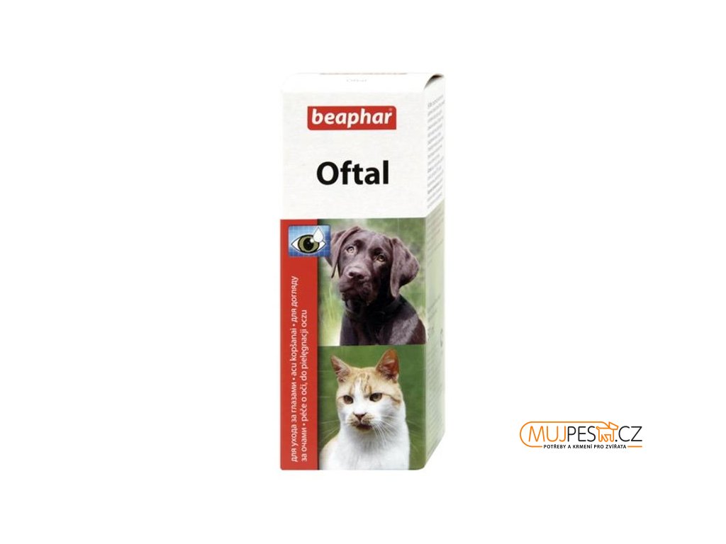 Přípravek pro péči o oči psů, koček a ostatních zvířat. Čištění očí a jejich okolí předchází podráždění od špíny a prachu. Oftal stimuluje přirozený proces čištění a zamezuje tvorbě tmavých skvrn pod očima.
