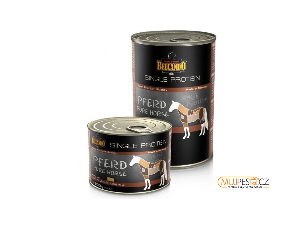 Složení: koňské maso, srdce, játra (73 %), vývar z koňského masa (27 %)