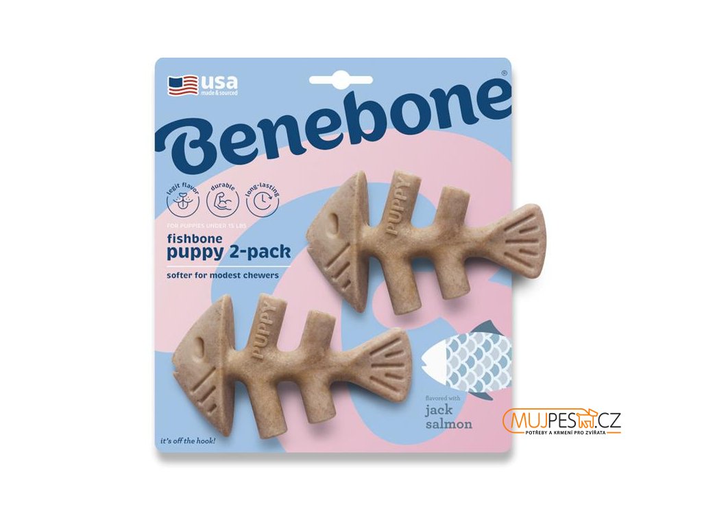 Ochucené hračky, které vydrží silné kousání a žvýkání. Díky prohnutému tvaru se psům dobře uchopují v zubech a dají se snadno přidržet tlapkou. Vůně ryby je jemná, takže pes ji ucítí, ale vy si jí pravděpodobně ani nevšimnete. Hračky Benebone řady Puppy jsou vyrobeny z o něco měkčího materiálu než Benebone pro dospělé psy. Jsou díky tomu vhodné pro štěňata do zhruba 7 kg s prořezávajícími se zuby.