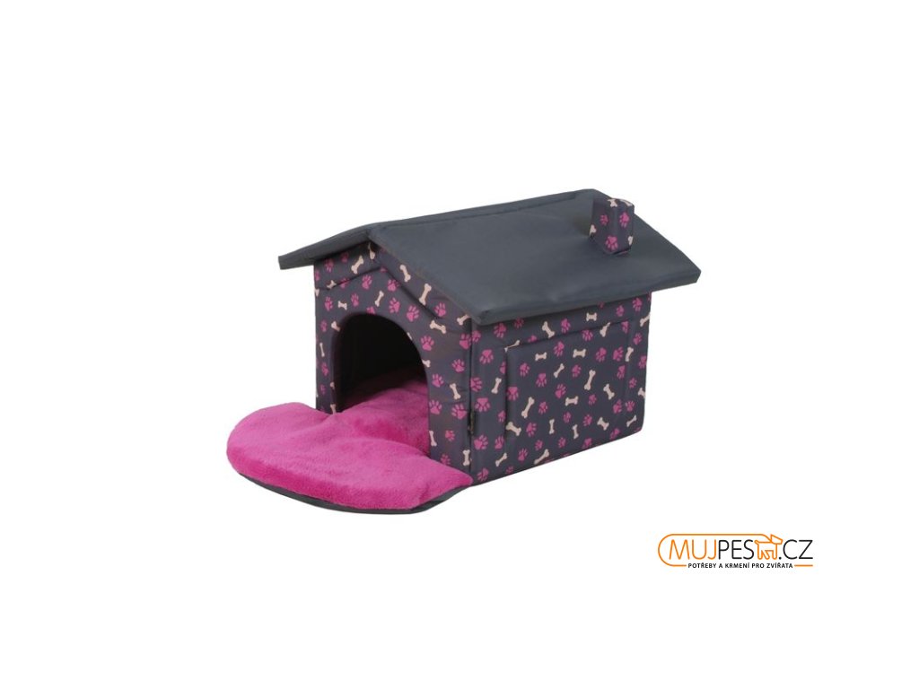 Útulné místečko s výhledem na měkké polštářku v uzavřeném prostoru. Bouda pro malé pejsky, kteří potřebují klid a bezpečí. Sladěné barvy tón v tónu v kombinaci s osvěžující růžovou.