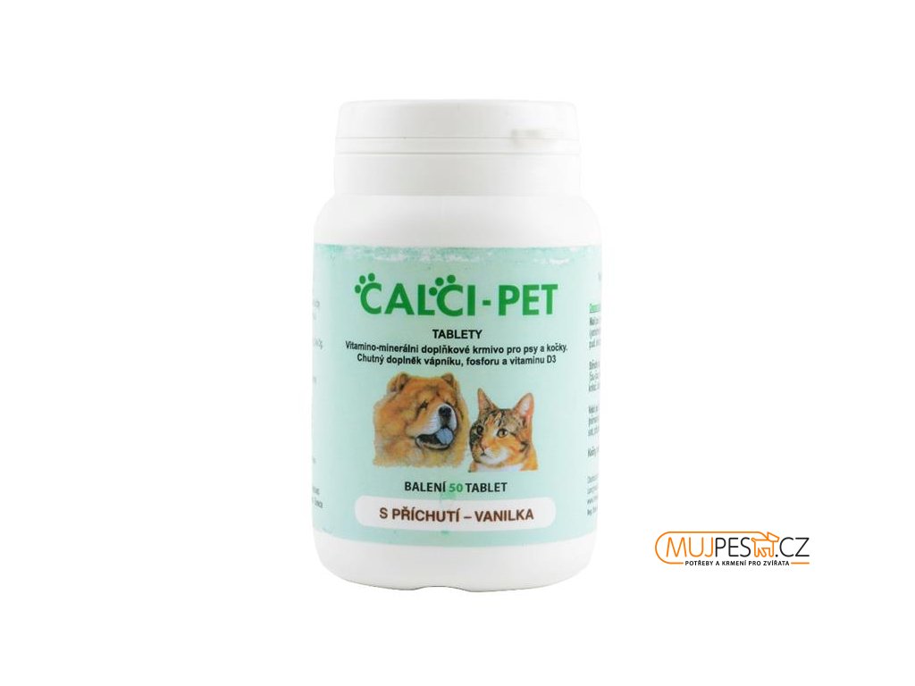 Doplňkové krmivo pro psy a kočky CALCI-PET tablety s příchutí vanilky.