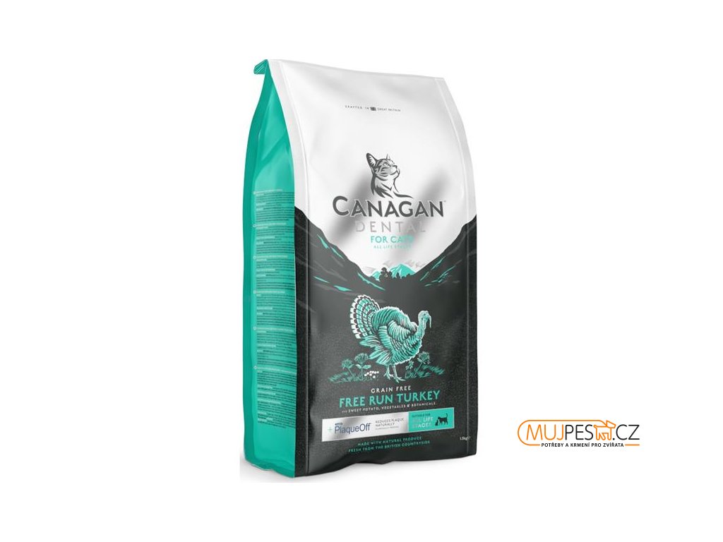 Kompletní krmivo pro kočky Canagan Dental je pečlivě připravená bezobilná receptura, jejíž hlavní složku tvoří maso krůt z volného chovu. Speciální složka ProDen PlaqueOff®, vyráběná z mořských řas získávaných podél severoatlantického pobřeží, pomáhá přirozeně snižovat tvorbu zubního plaku (do slin uvolňuje složky, které rozkládají bakteriální povlak na zubech).