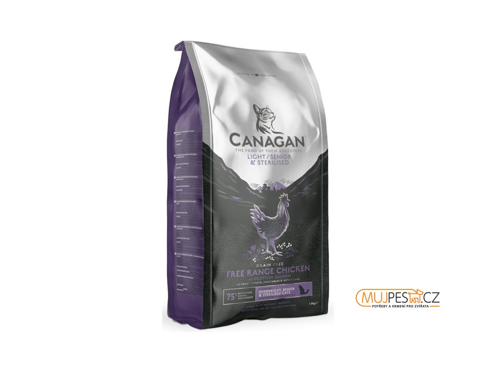 Canagan Cat LIGHT / SENIOR / STERILISED with Chicken & Salmon – receptura bez obilovin, která je připravena speciálně pro kočky s nadváhou nebo se sklony k nadváze, pro starší kočky a/nebo pro kastrované kočky. Čerstvé kuřecí maso z volně chovaných kuřat a čerstvé maso z lososa používá Canagan pouze v kvalitě pro lidskou spotřebu. Živočišné suroviny jsou perfektně doplněny mnoha druhy zeleniny a bylin.