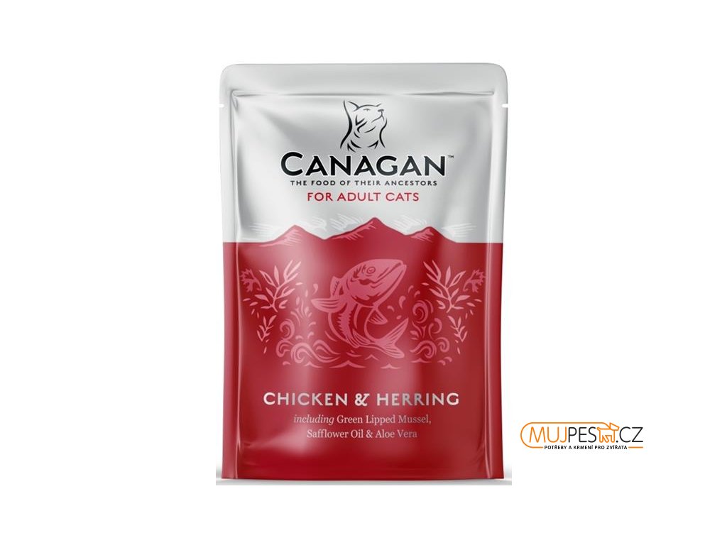 Canagan Chicken & Herring - je kompletní krmivo pro dospělé kočky z kuřecího masa a sleďů v receptuře bez obilovin. Nejlepší kousky masa (v každé kapsičce je až 80 % živočišných surovin) pro zdraví a skvělou chuť krmiva. Zelená škeble navíc představuje přirozený zdroj glukosaminu a pomáhá pečovat o zdravé klouby vaší kočky.