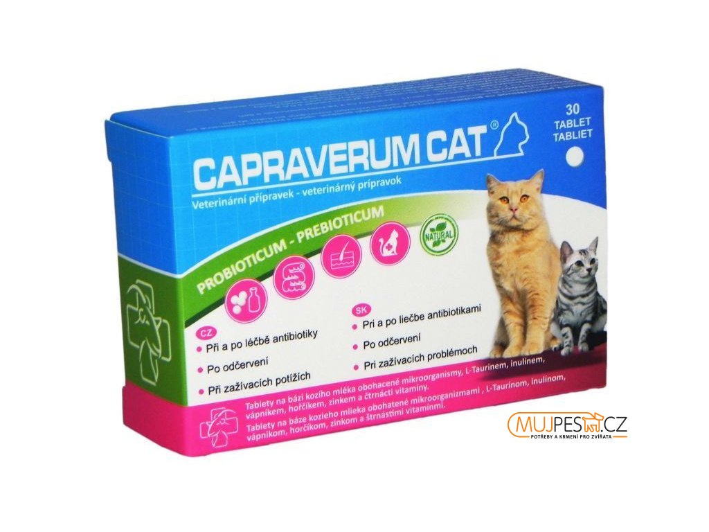 CAPRAVERUM CAT probioticum-prebioticum jsou tablety na bázi kozího mléka obohacené o všechny nejdůležitější vitamíny a užitečné mikroorganismy (Enterococcus faecium), inulin. Inulín je rozpustná fermentovatelná vláknina, která plní s kozím mlékem prebiotickou funkci a podporuje růst žádoucí střevní mikroflóry. Tablety mají optimální poměr kostitvorných minerálních látek - vápníku, fosforu, hořčíku a zinku, obsahují všechny esenciální aminokyseliny a lehko stravitelné tuky. Zlepšují stravitelnost živin z krmné dávky, působí příznivě na činnost trávicího traktu , jater a slinivky. Komplex mikroorganismů, vitamínů a zinku chrání trávicí trakt a kůži, podílí se na obraně organismu před infekcemi. Pomáhá obnovit zdravou střevní mikroflóru při léčbě antibiotiky a po jejím ukončení. Přispívá k prevenci a léčbě střevních onemocnění.