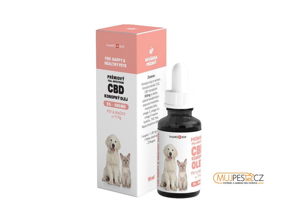 SwissMEDHEMP si zakládá na kvalitě svých výrobků, a proto jejich oleje extrahované z konopí pěstovaného ve Švýcarsku a Sardinii bez použití pesticidů a herbicidů, splňují nejvyšší požadavky. Při výrobě byl použit i MCT olej, který umožňuje rychlejší a snadnější vstřebávání v těle. Aby olej domácím mazlíčkům chutnal, je doplněn hovězí příchutí. Omega-3 mastné kyseliny podporují zdraví kůže a srsti a přírodní antioxidanty pomáhají posílit a udržet v kondici imunní systém. CBD konopný olej je nepsychoaktivní látkou, neobsahuje THC.