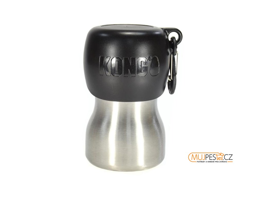 Každý pes potřebuje dostatečný přísun pitné vody – na dlouhé procházce, při cestování, po venkovní aktivitě, a to zvláště za horkých dnů. Láhev KONG H2O se pro dodržení pitného režimu dokonale hodí. Snadno se přenáší a díky karabině lze připnout např. na batoh. Vzhledem k objemu je cestovní láhev vhodná pro malé až středně velké psy. Je vyrobena z nerezové oceli, odolná proti vytečení a 100% recyklovatelná. Šroubovací uzávěr z netoxického polypropylenového materiálu lze použít jako napájecí misku.