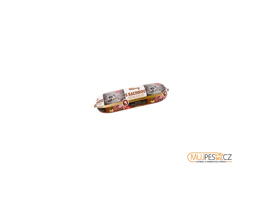 Složení: maso a výrobky živočišného původu, kachní masový ořez, krky, křídla, žaludky, játra, srdce, rýžová moučka, jablka, lněné semínko a tymián