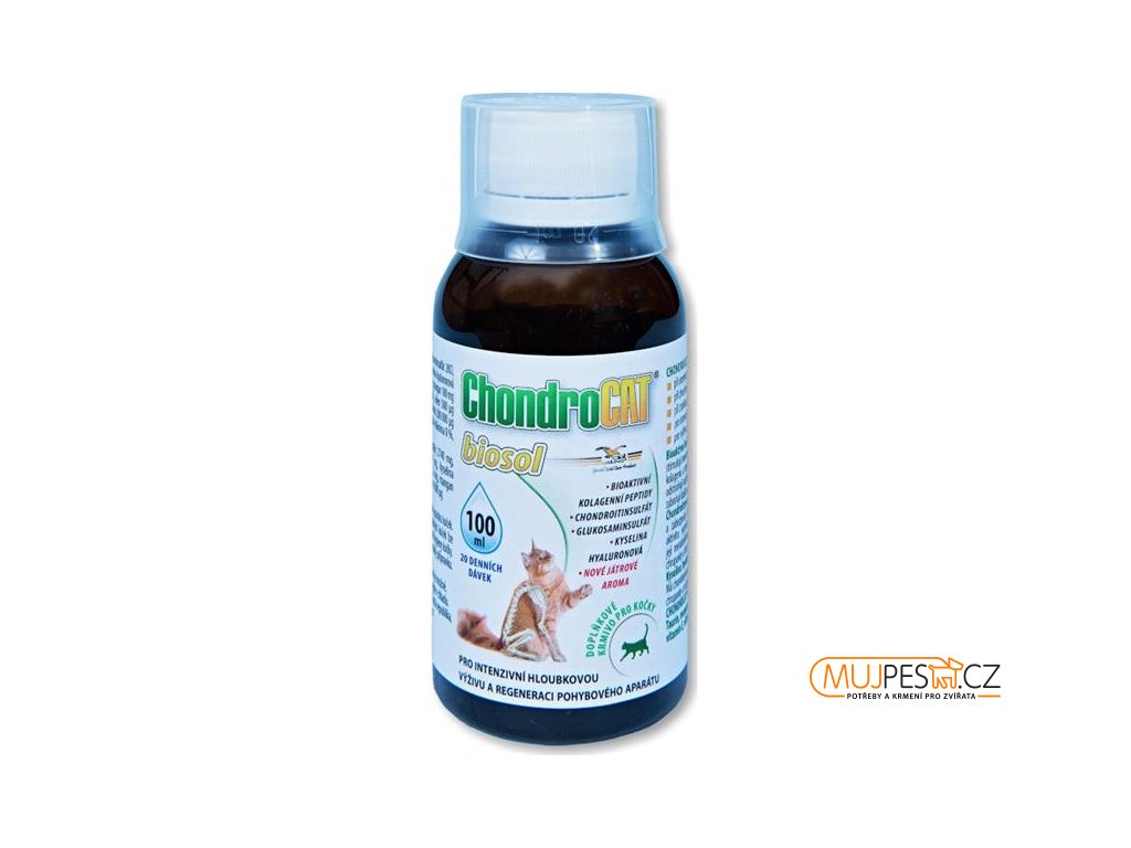ChondroCAT biosol obsahuje komplex biologicky aktivních látek pozitivně ovlivňujících regenerační procesy v kloubních, šlachových a vazivových tkáních a zvyšujících kloubní pohyblivost.