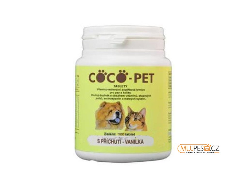 Doplňkové krmivo pro psy a kočky COCO-PET tablety s příchutí vanilky.