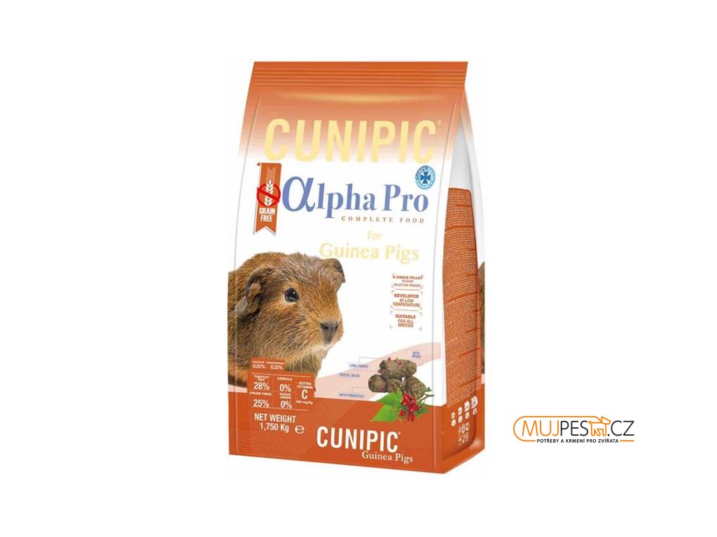 Cunipic Alpha Pro Guinea Pig – morče. Kompletní krmivo bez obsahu obilovin. Zdravá, velice chutná a vyvážená receptura pro morčata. Každá granule obsahuje všechny nezbytné suroviny a vitamíny pro zdraví morčete bez výkyvů v příjmu živin. Krmivo s vysokým obsahem vlákniny (25 %), bez přidaných barviv a cukrů vhodné pro všechna plemena.