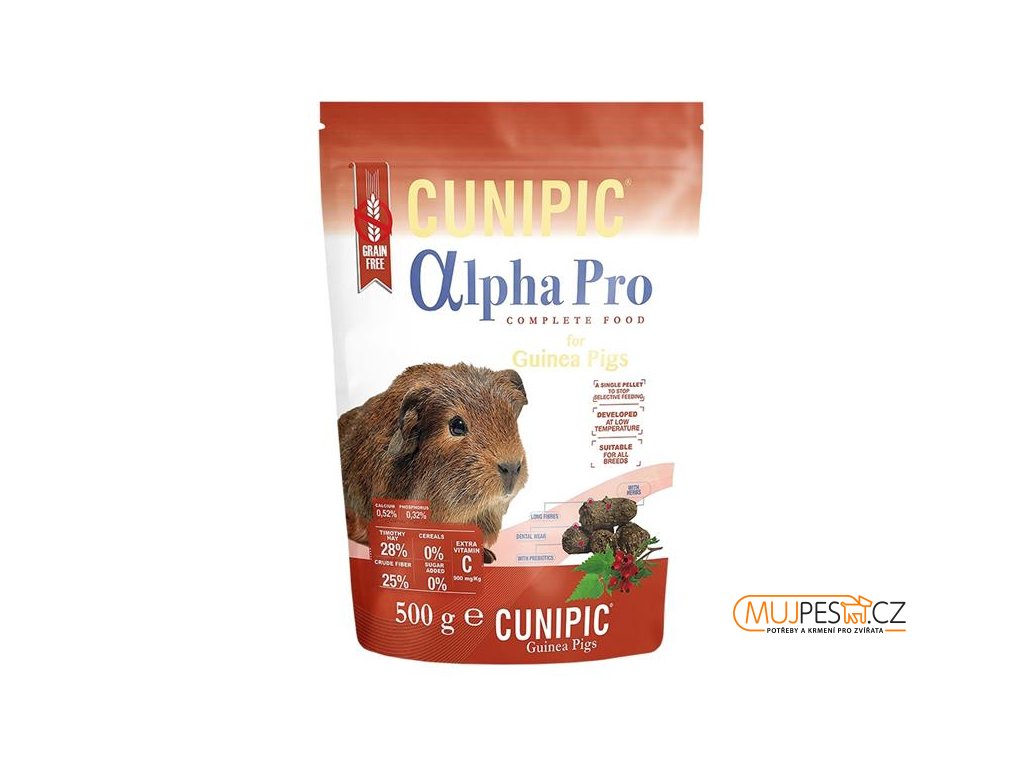 Cunipic Alpha Pro Guinea Pig – morče. Kompletní krmivo bez obsahu obilovin. Zdravá, velice chutná a vyvážená receptura pro morčata. Každá granule obsahuje všechny nezbytné suroviny a vitamíny pro zdraví morčete bez výkyvů v příjmu živin. Krmivo s vysokým obsahem vlákniny (25 %), bez přidaných barviv a cukrů vhodné pro všechna plemena.