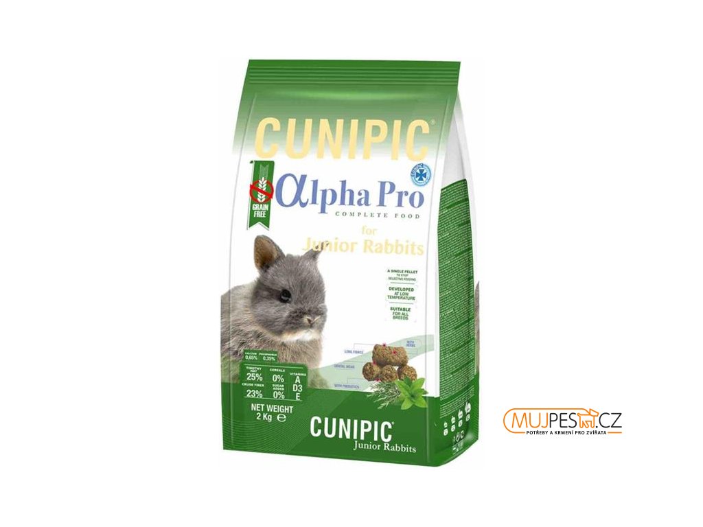 Cunipic Alpha Pro Junior Rabbit – mladý králík. Kompletní krmivo bez obsahu obilovin. Zdravá, velice chutná a vyvážená receptura pro mladé králíky (do 6 měsíců věku). Každá granule obsahuje všechny nezbytné suroviny a vitamíny pro zdraví králíka bez výkyvů v příjmu živin. Krmivo s vysokým obsahem vlákniny (23 %), bez přidaných barviv a cukrů vhodné pro všechna plemena.