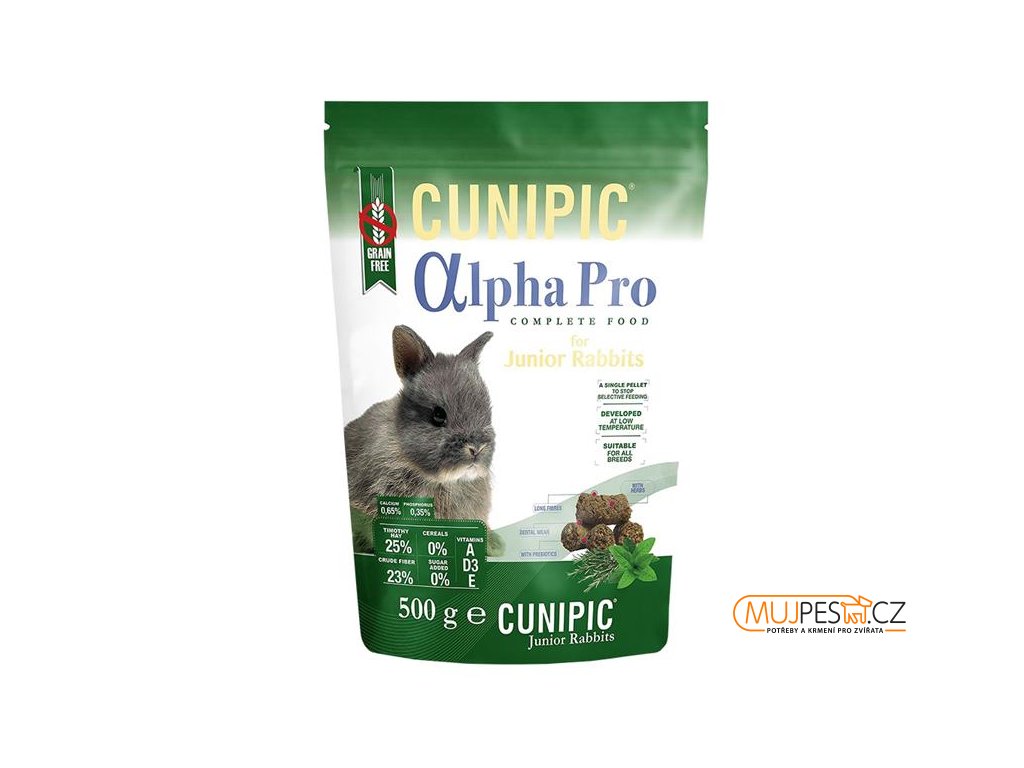 Cunipic Alpha Pro Junior Rabbit – mladý králík. Kompletní krmivo bez obsahu obilovin. Zdravá, velice chutná a vyvážená receptura pro mladé králíky (do 6 měsíců věku). Každá granule obsahuje všechny nezbytné suroviny a vitamíny pro zdraví králíka bez výkyvů v příjmu živin. Krmivo s vysokým obsahem vlákniny (23 %), bez přidaných barviv a cukrů vhodné pro všechna plemena.