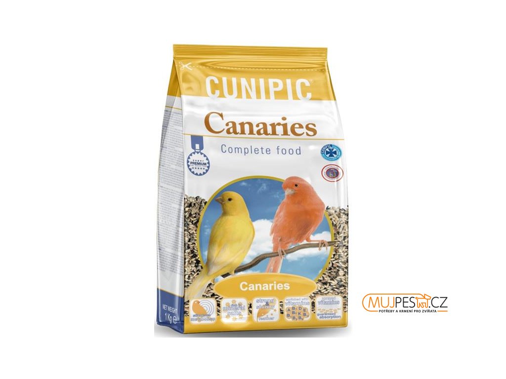 Cunipic® Canaries - kompletní krmivo bohaté na uhlohydráty a bílkoviny, speciálně vyvinuté pro kanárky. Obsahuje 6 druhů semínek. Krmivo je bohaté na vitaminy A, B1, B2, B6, B12, C, D, E, H, K, na uhlohydráty a minerální soli; povzbuzuje metabolismus a podporuje zdravé a lesklé peří. Vitaminy jsou do krmiva přidávány formou nástřiku na jednotlivých zrníčkách, čímž máte jistotu, že pták vitaminy přijme.