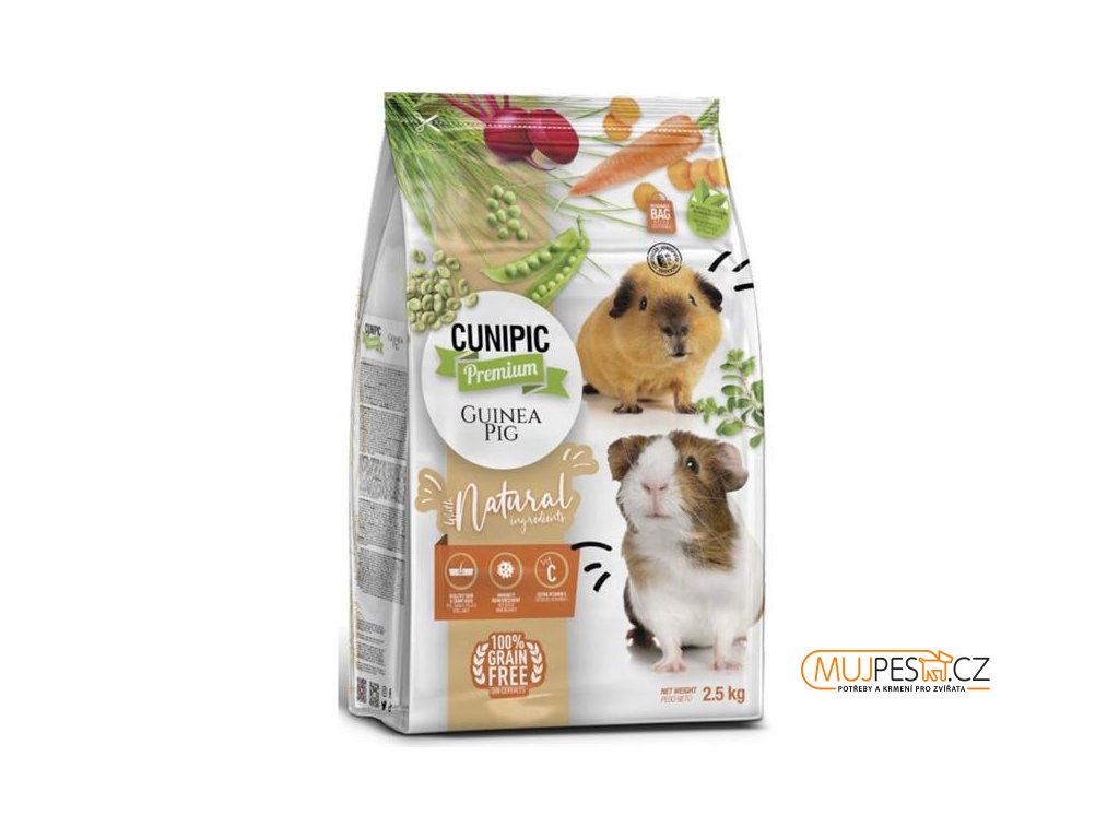 Nutričně kompletní a vyvážená grain-free směs pro morčata všech druhů a věkových skupin pomáhá svým specifickým složením udržet zvíře zdravé a ve skvělé kondici. Kvalitní přírodní suroviny dodávají krmivu vynikající chutnost i bez použití umělých přísad. Bezobilné složení výrazně omezuje vznik případných alergických reakcí a nízký obsah tuků přispívá k prevenci obezity. Krmivo je bohatým zdrojem esenciálních mastných kyselin, které podporují zdraví kůže a srsti. Kromě toho pomáhá udržet silné kosti a svaly a přispívá ke správnému trávení. Přidané vitamíny (včetně vitamínu C) a minerály podporují zdravý metabolismus a posilují imunitu. Produkt je balen v ochranné atmosféře, která zajišťuje jeho dlouhodobou čerstvost a uchování živin.