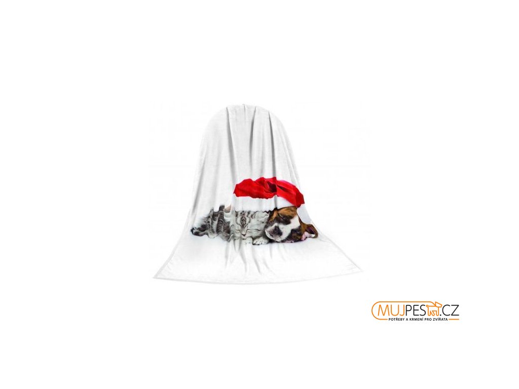 Příjemně heboučká deka z mikrovlákna s potiskem štěňátka a koťátka s vánoční čepičkou.