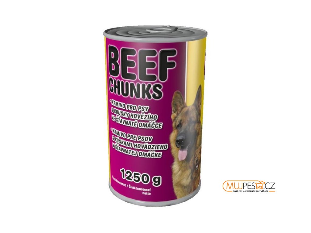 Beef Chunks konzerva je krmivo pro psy s vyváženým složením. Konzerva je plná šťavnatých hovězích kousků v ochucené omáčce, doplněna minerálními látkami a vitamíny. Jako zdroj energie jsou užívány kvalitní oleje a živočišné tuky. Má vynikající chuť i aroma.
