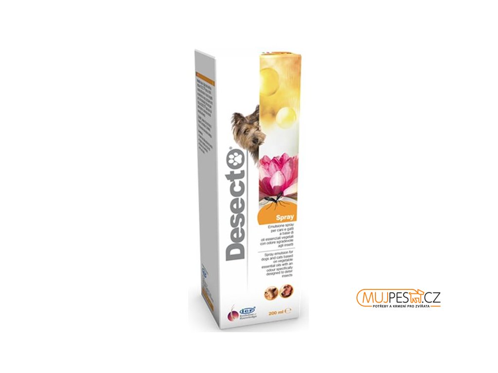 Desecto je repelentní sprejová emulze k ošetření koček a psů. Obsahuje specifické esenciální oleje rostlin, jejichž vůně odpuzuje hmyz.