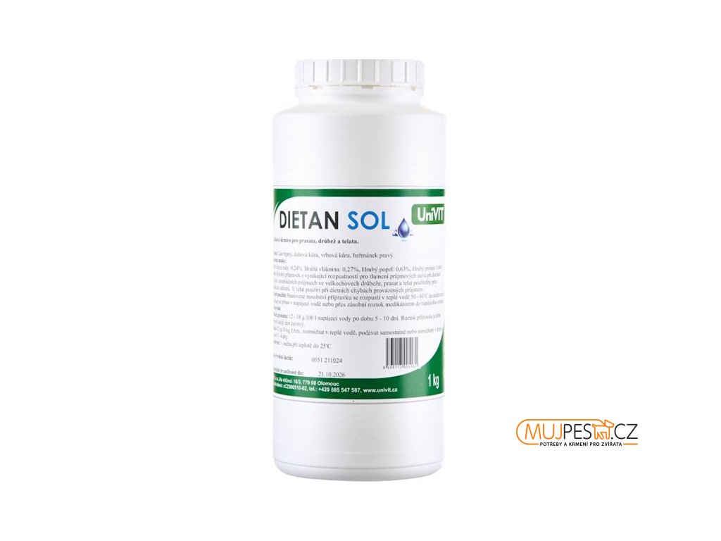 Přírodní bylinný přípravek se používá jako součást opatření proti průjmům způsobeným dietetickými chybami ve výživě zvířat. Dietan Sol snižuje množství škodlivých mikroorganismů, chrání střevní sliznici a zabraňuje vstřebávání škodlivých látek.