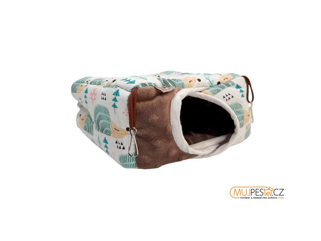 Domek dr.savec závěsný M, ježci na bílé, hnědá minky 18x18x11cm