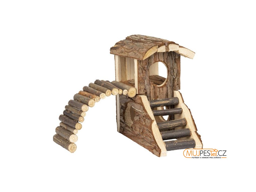 Patrový domek se žebříkem z přírodního dřeva s kůrou. Poskytne křečkům, myškám a dalším drobným hlodavcům prostor pro aktivitu, díky prolézačkám, žebříku a mostu, ale také klidné a bezpečné místo k odpočinku. Zároveň domek poslouží jako vhodný materiál k okusu a broušení hlodavých zubů.