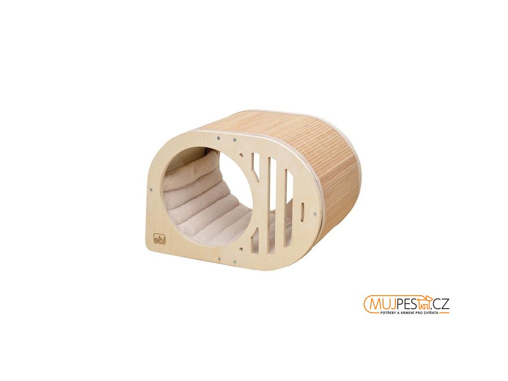 Domeček EBI Tara je vyroben z překližky a bambusu. Součástí je měkký polštář z hebké imitace kožešiny, který je uvnitř uchycen pomocí suchého zipu. Domek má velké otvory vpředu i vzadu (Ø 30 cm) a průhledy do okolí. Díky své šířce je velmi pohodlný na odpočinek.