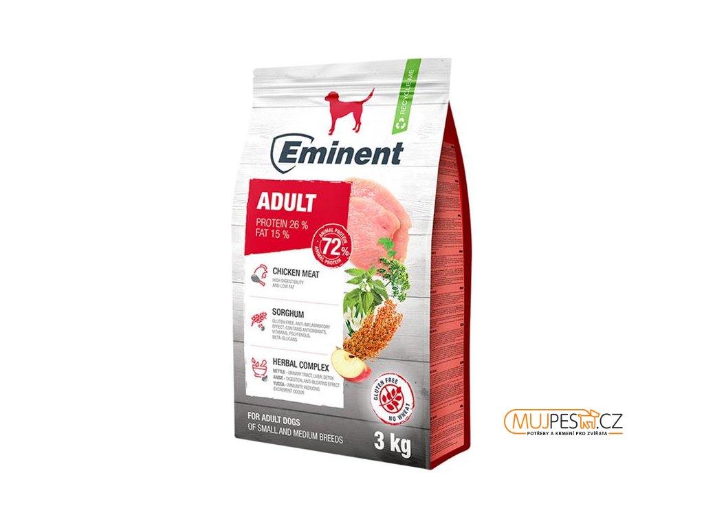 Kompletní krmivo Eminent Adult je určené pro dospělé psy malých a středních plemen. Kuřecí bílkoviny dodávají nezbytné živiny pro udržení svalové hmoty a vitality. Vyvážený obsah tuků dodává energii a pomáhá psovi udržet zdravou hmotnost. Kombinace omega mastných kyselin a esenciálních vitamínů dodává lesk srsti a odolnost kůži. Prebiotika (FOS a MOS) přispívají ke zdravému trávení, které je klíčem k celkovému zdraví psa.
