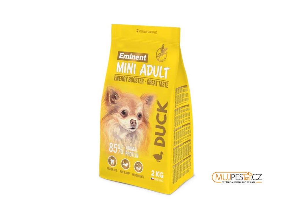 Kompletní krmivo Eminent Mini Duck je skvělou volbou pro dospělé psy malých a mini plemen, kteří žijí aktivním způsobem života, milují sport, pohyb a mají vyšší nároky na energii. Kachní maso v kombinaci s hydrolyzovanými kachními játry je ideální pro psí gurmány, kteří trvají jen na tom nejchutnějším krmivu. Batáty a kořenová zelenina jsou zdrojem vitamínů a minerálů a prospívají zdraví trávicího traktu.