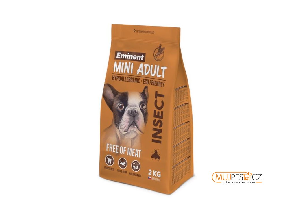 Hypoalergenní kompletní krmivo Eminent Mini Insect je vhodné pro dospělé psy malých a mini plemen, kteří trpí alergiemi na běžně používané zdroje proteinů (hovězí, vepřové apod.). Krmivo neobsahuje maso (pouze drůbeží tuk), aby riziko alergické reakce bylo co nejnižší. Hlavním zdrojem proteinu je hmyz bohatý na kvalitní bílkoviny, vitamíny a minerály. Chov hmyzu je navíc šetrný k životnímu prostředí. Granule jsou obohacené o vejce, mají vyvážený obsah aminokyselin a jsou nutričně hodnotné.